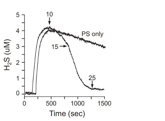 图3 通过TBR4100检测多硫化物(20mM)在没有过氧化氢酶(peroxidase: PS)或添加10、15和25mM过氧化氢酶后,H₂S浓度随时间的变化。