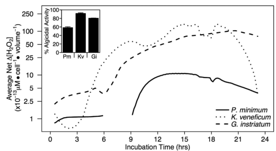 图2 通过TBR4100检测有害藻类(P. minimum, K. veneficum和G. instriatum)在暴露于灭藻剂IRI-160AA后细胞外H₂O₂的表达变化。